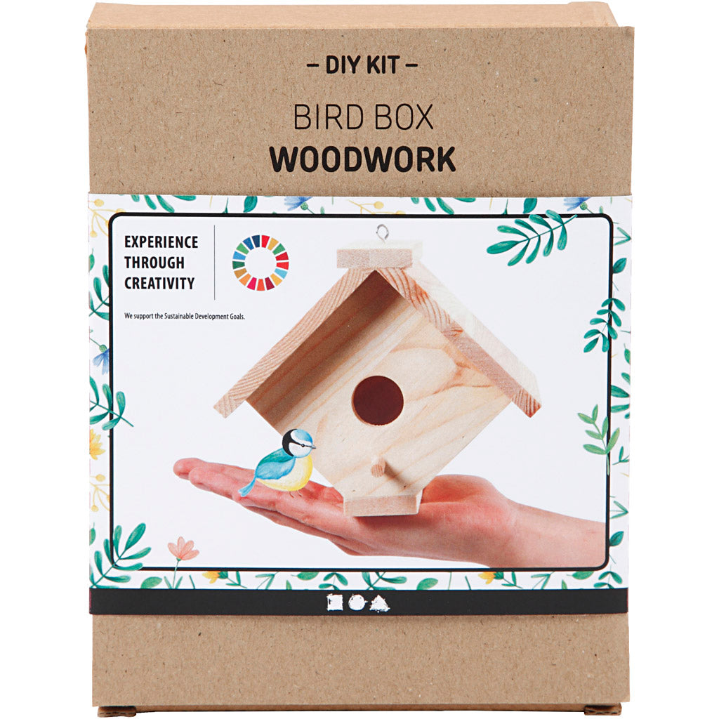 Set de matériel à assembler pour la confection d'un nichoir en bois clair avec un trou de 25 mm. Instructions incluses