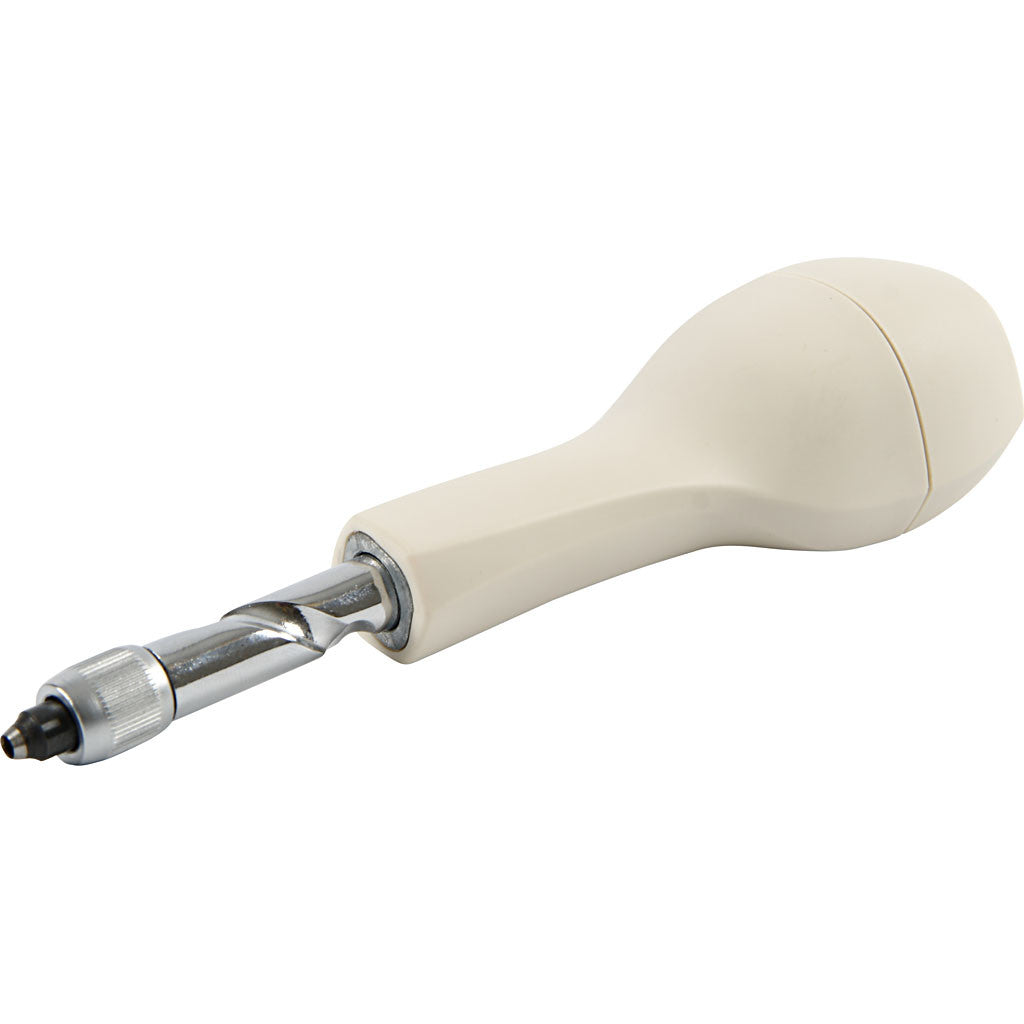 Poinçon vis pour faire des trous de trois diamètres différents dans p.ex. plusieurs épaisseurs de plastique, du papier cartonné du placage, du liège, du cuir, ou une feuille métallique. Les têtes de rechange peuvent être stockées dans le manche