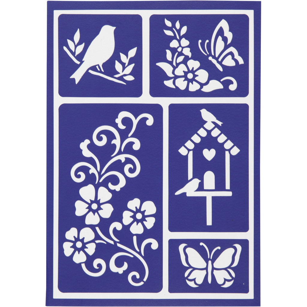 Zelfklevend flexibel sjabloon geschikt voor papier, glas, hout, porselein, etc. Elk vel bestaat uit meerdere motieven die apart gebruikt kunnen worden.
