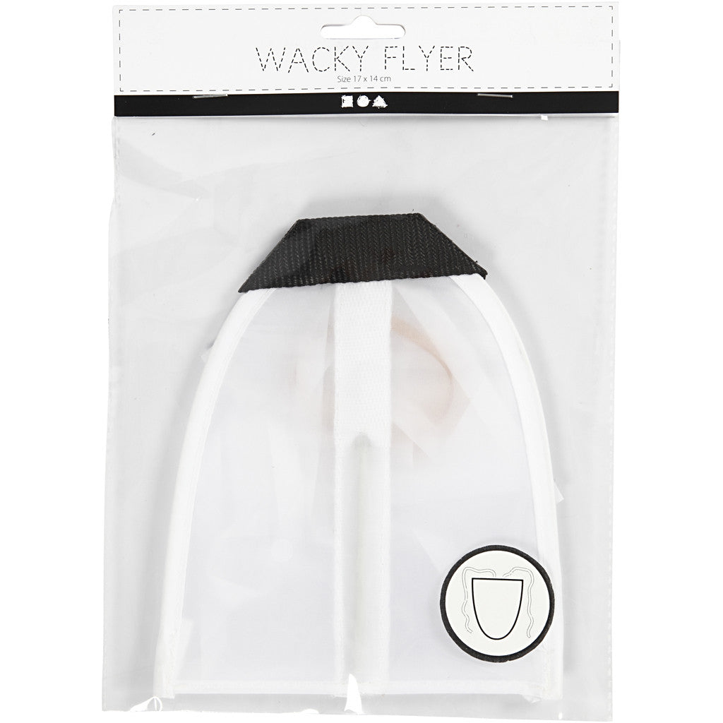 Leuke vlieger van nylon voor kinderen. Laat vliegen met behulp van de dikke elastische elastiekjes. Gemakkelijk te versieren met een textielstift of vergelijkbaar.