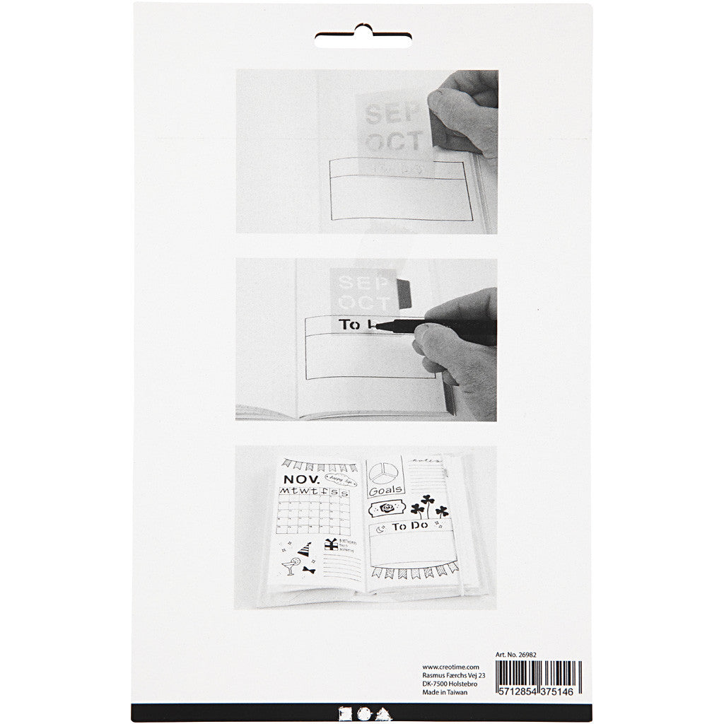 Zelfklevend, niet-permanente Plastiek sjabloon met verschillende vormen en ontwerpen geschikt voor bulletjournals. Wordt geleverd op acrylplaten met gaten die erin kunnen worden gestoken en passen in de planner artikelnr. 192648-651. Was na gebruik met lauwwarm water .